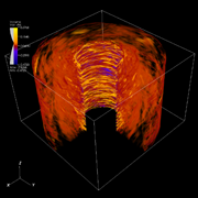 This project, led by by Fausto Cattaneo, University of Chicago, used a previous allotment of 2 million processor-hours to study the forces that help newly born stars and black holes increase in size. In space, gases and other matter often form swirling disks around attracting central objects such as newly formed stars. The presence of magnetic fields can cause the disks to become unstable and develop turbulence, thereby causing the disk material to fall onto the central object. This run at NERSC was used to set up initial conditions for a larger scale simulations. The Visualization Group assisted this project in generating High-quality visualizations of data produced in these runs. Based on these initial results, the project continues to carry out large-scale simulations to test theories on how turbulence can develop in such disks. Gunther H. Weber.