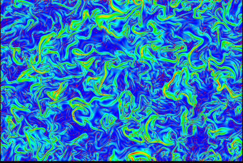 These images depict increasing ((a) through (f)) iso-concentrations of hydrogen radicals (H) colored by values from the correlation field of oxygen (O2) and perhydroxyl radical (HO2). Each isosurface exhibits striations in the correlation field (i.e., bands of negative, zero, and positive correlation), and as H concentration increases, correlation increases within each striation (i.e., negative correlation tends to become positive). This behavior suggests that H concentration is itself positively correlated with the O2 -HO2 correlation. Image (f) indicates the simultaneous existence of near-zero correlation (i.e., high entropy) and high H concentrations. Images generated by Luke Gosink using VisIt. Data provided by Marc Day and John Bell from - Center for Computational Sciences and Engineering at LBNL